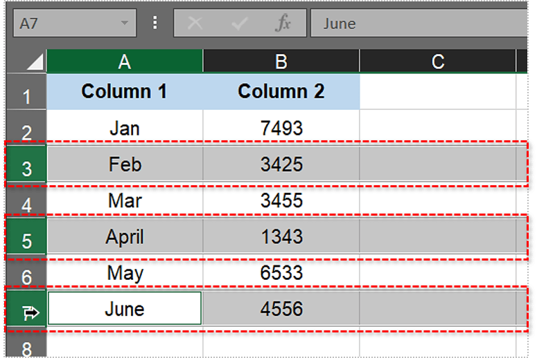 第3、5、7行是表格中每隔一行上面,因为它还包括一个列标题。单击电子表格最左侧的“3”以选择第三行。按住 Ctrl 键并单击第 5 行和第 7 行以选择第五行和第七行。