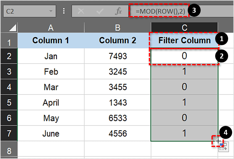 要向电子表格表格添加过滤器,请按 Ctrl + Z 热键撤消先前对第三、第五和第七行的擦除。在单元格 C1 中输入“过滤列”。选择 C2,在 fx 栏中输入‘=MOD(ROW(),2)’,然后按回车键。然后点击单元格C2的右下角,按住鼠标左键并将光标向下拖动到C7,将MOD函数复制到其余部分e列如下图。