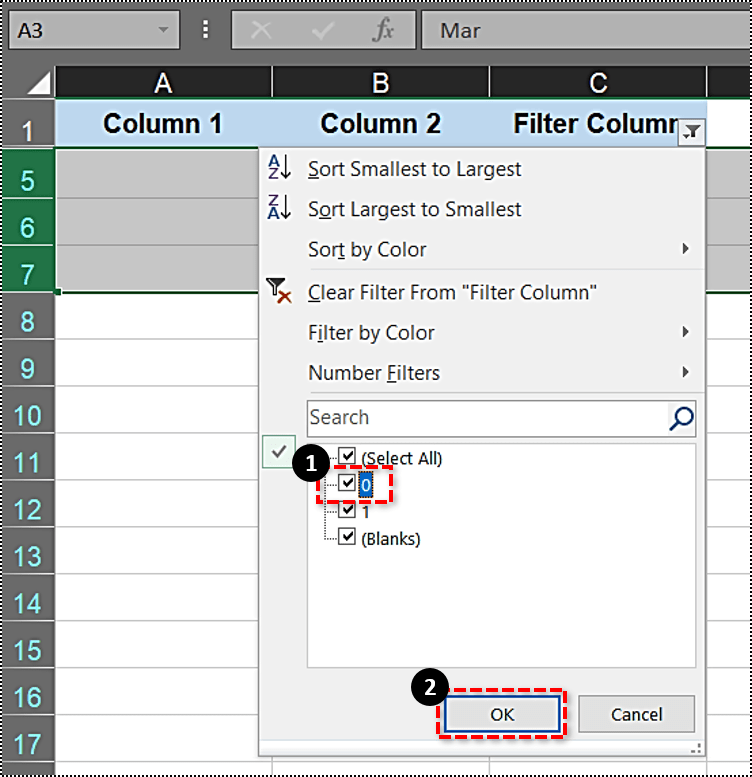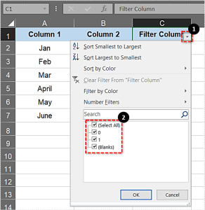 点击小箭头打开如下过滤选项。在那里您可以选择0 和1 复选框。取消选择这些复选框会从表格中过滤掉表格行。
