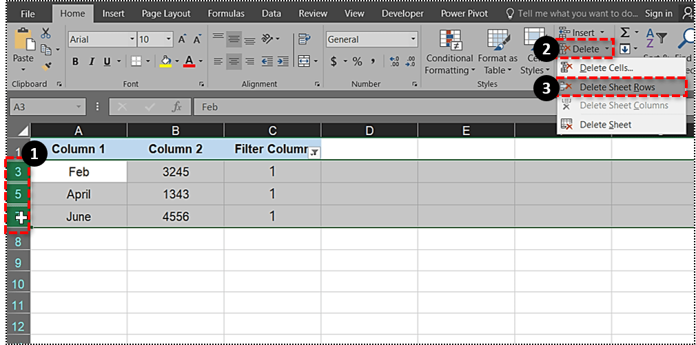 现在您可以快速从表格中每隔两行擦除一次。单击第 3 行标题并将光标向下拖动到 7 以选择第三、第五和第七行。按“主页”选项卡上的删除 下拉菜单,然后选择删除工作表行。