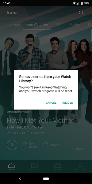 Hulu 表示,您还可以通过滚动到“继续观看”面板的底部并单击“所有观看历史记录”来批量删除和删除移动应用程序中的所有节目。这使您可以选择使用每个节目旁边的复选框选择器来选择节目,您最终可以删除它。不清楚是否我们的个人资料根本没有足够的节目来为我们提供此选项,或者“所有观看历史记录”页面已移至应用程序的其他位置(Hulu 表示,截至 2018 年 6 月 1 日,它位于“继续观看”页面的底部) ,但我们最终找不到该选项。尽管如此,Hulu 说它就在那里,我们暂时倾向于相信他们的话。