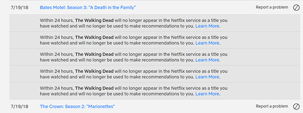 也就是说,有时您会找到你最讨厌的节目或电影。无论是让您感到不舒服或冒犯您的敏感度的节目,还是一部从您身下拔出地毯并诱使您认为这完全是另一回事的电影,我们都对生活中的娱乐感到失望。虽然传统的有线电视服务让您忘记并忽略某个节目让您觉得自己在浪费时间,但 Netflix 和 Hulu 不会让您忘记您看过的内容。您观看历史中糟糕的系列或电影不会轻易消失,特别是如果您没有完成这部电影。它会出现在您的 Netflix 或 Hulu 界面中,从继续观看部分到您推荐的电影。