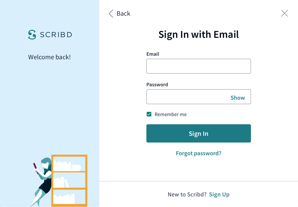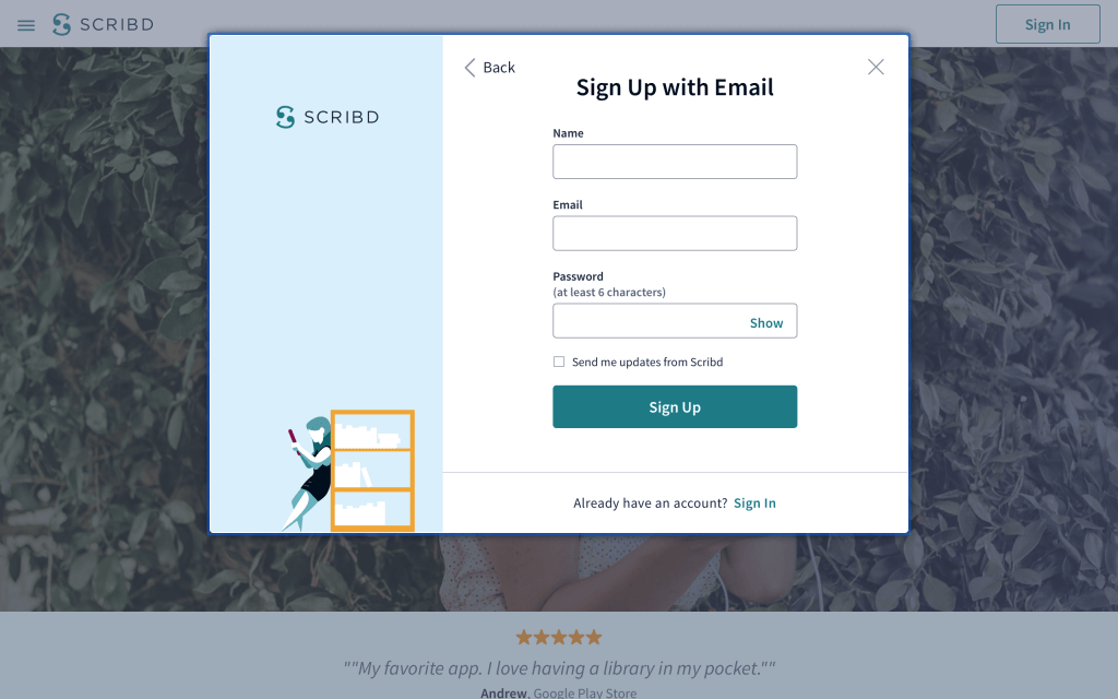 首先前往 Scribd.com 并注册一个新账户。或者,如果您已经拥有 Scribd 帐户,您可以通过登录使用您现有的帐户。Scribd 支持使用 Facebook 和 Google 登录的帐户,因此创建新帐户就像单击按钮并链接您的帐户一样简单。