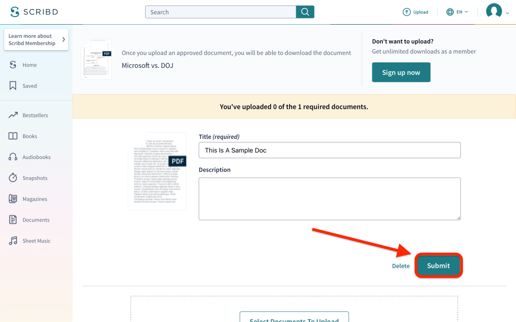 文档可以包含任何内容,包括直胡言乱语;如果您不知道要写什么,我们建议您使用 Lorem Ipsum 生成器。只需确保它至少包含一两页文本,否则 Scribd 不会接受它作为上传文件。创建此文档后,返回 Scribd 网页并单击选择要上传的文档. 上传文档后,为新文件提供标题并点击提交。