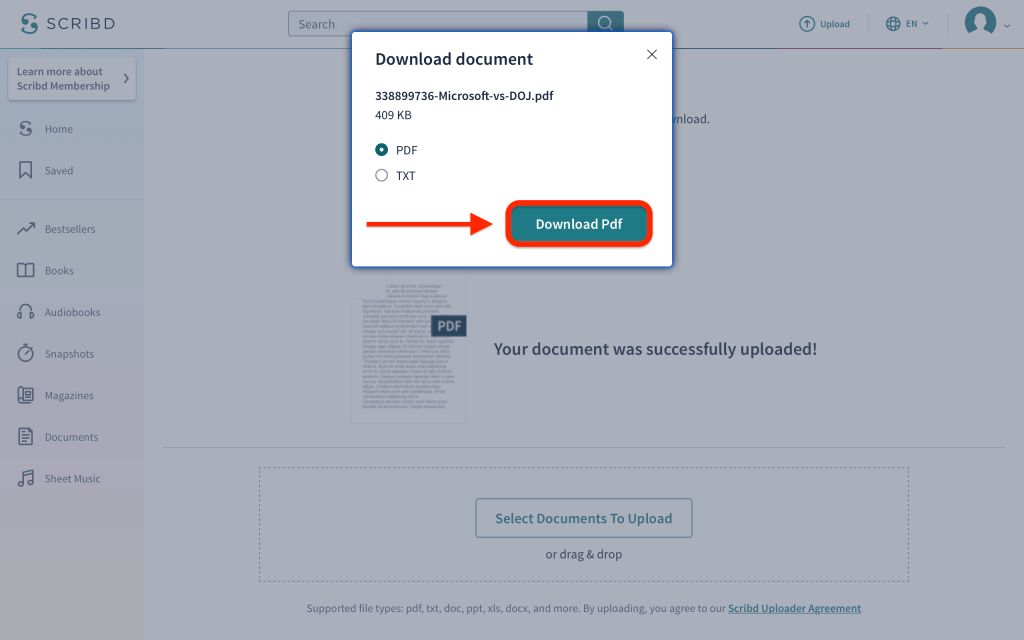 屏幕顶部会出现一个新的弹出窗口,让您可以免费下载想要下载的原始文档。只需选择您的文件格式(PDF 或 TXT),然后按下载。几秒钟后,您应该会在下载文件夹中看到您下载的文件。