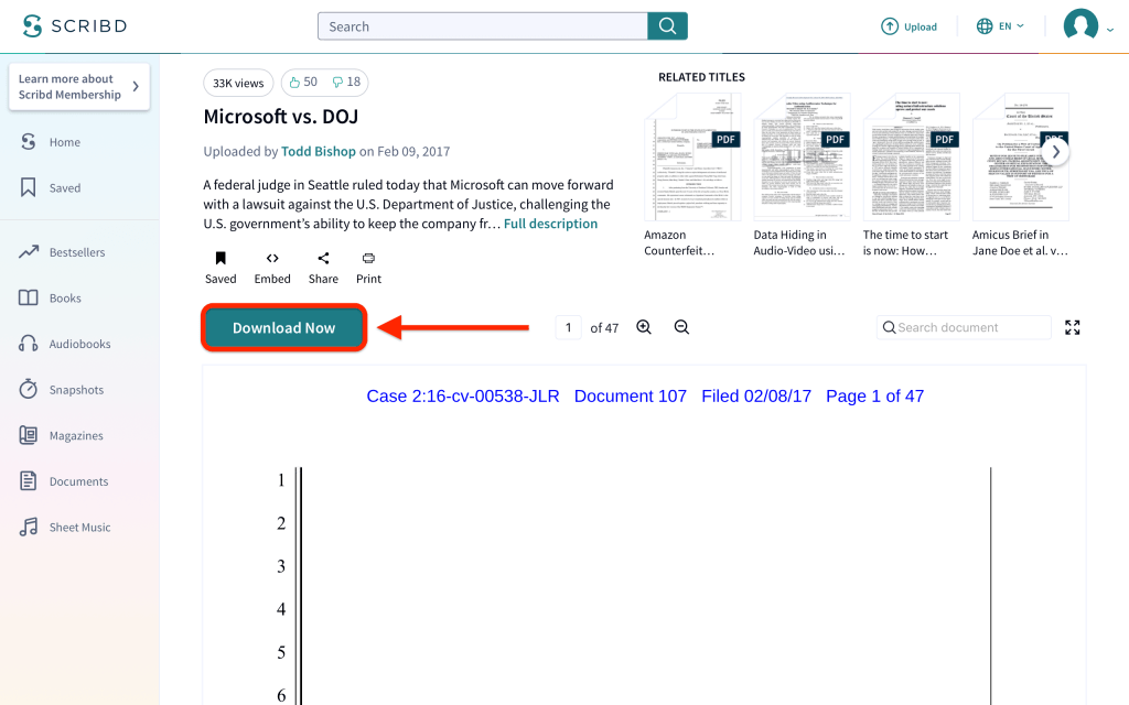 安装 Greasemonkey 脚本后,您应该能够使用页面顶部显示的下载密钥在浏览器中下载 Scribd 文档。也就是说,因为 Scribd 会不断更改他们的网站,所以我们不能总是保证您能够找到一个有效的脚本。在我们的测试中,我们发现使用此处的脚本以及 GreasyFork 上的一些脚本取得了成功,其中还包括在 Scribd 上去除模糊文档的选项。
