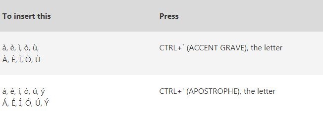 如果您需要插入多个带重音的字母,或者不想在一大堆特殊符号和陌生字母中滚动,键盘快捷键可能是您最好的选择。这种方法的缺点是你要么必须记住每个不同字母的组合,要么依赖图表。它是如何工作的?