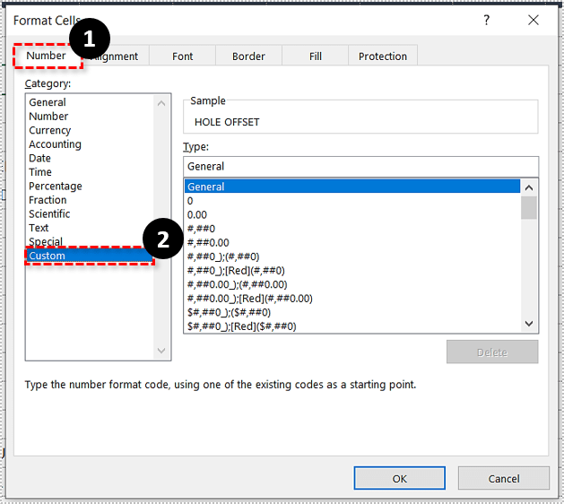 - 在“单元格格式”窗口中出现时,“数字”选项卡已被选中。在左侧的“类别”部分,从“常规”移至“自定义”。