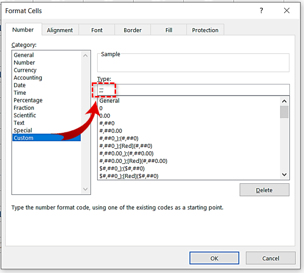 - 在“类型”中更改其类型从“一般”到“;;;”的部分(三个分号)。