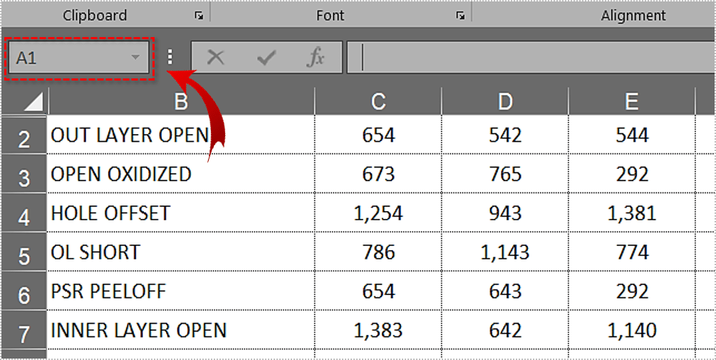 为此,请在名称框中键入单元格的位置。例如,如果要取消隐藏第一行和第一列,请输入“A1”。