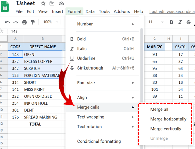 您还可以合并 Google 表格中的单元格。为此,只需选择要合并的一组单元格,前往屏幕左上角的“格式”选项卡,操作至“合并单元格”,然后在“全部合并”、“合并”之间进行选择水平”或“垂直合并”。您也可以按照类似的步骤对行和列执行相同的操作。
