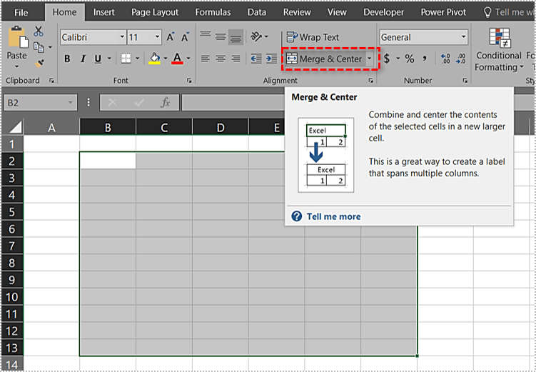 - 调整插入的大小图像以适合单元格。您还可以选择放大单元格或将几个单元格合并在一起。要合并单元格,请在左键单击目标单元格的同时按住 Shift 选择并突出显示它们。然后点击 Merge &居中图标。