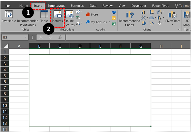 - 根据您的图像调整好单元格大小后,单击“插入”选项卡并选择插图 在菜单功能区中。从下拉选项中,选择您希望如何加载图像。在本教程中,我们选择了图片。