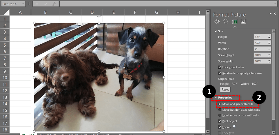 - 在尺寸和属性标签中,向下滚动到属性部分并打开它。单击用于移动和调整单元格大小的单选按钮。
