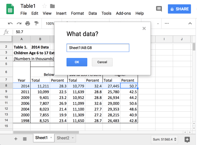 现在,让我们尝试另一个选项:选择一系列单元格。当我们选择这个选项时,会出现另一个对话框,上面写着“什么数据?” (专业提示:您可以单击并拖动此对话框以将其移开。)