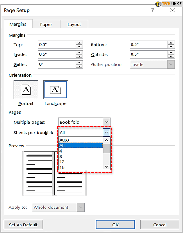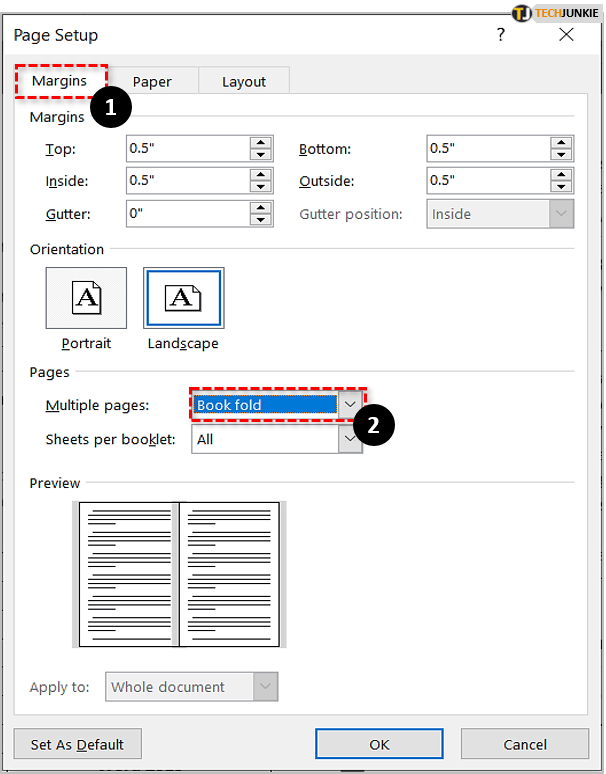 您需要在“页面设置”窗口中更改一些设置。首先点击边距选项卡,选择“多页”旁边的下拉窗口,然后选择“书本折叠”。