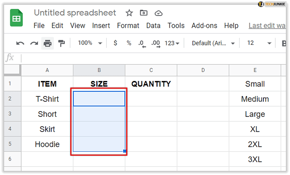 - 通过拖动鼠标或使用 Shift 或 Ctrl 键突出显示要包含在下拉列表中的单元格。如果您想在单个列或角色中制作下拉列表;单击标题(例如 A 列或第 1 行),整个部分将突出显示。