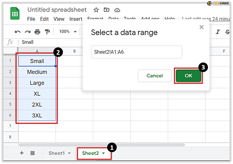 - 单击 Sheet2 并在此处手动选择要显示在下拉列表中的数据。完成后点击“确定”。