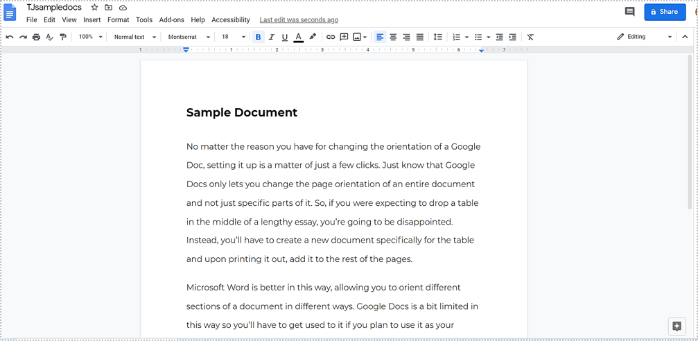 只要关闭窗口,您就会注意到页面更宽了,并且能够容纳扩展元素。该文档会立即从一侧翻转为横向页面布局,从而在整个页面上拉伸您添加的任何表格、文本和图像。在这一点上,您可以添加额外的宽图像和表格,并让它们看起来比默认纵向方向更好。
