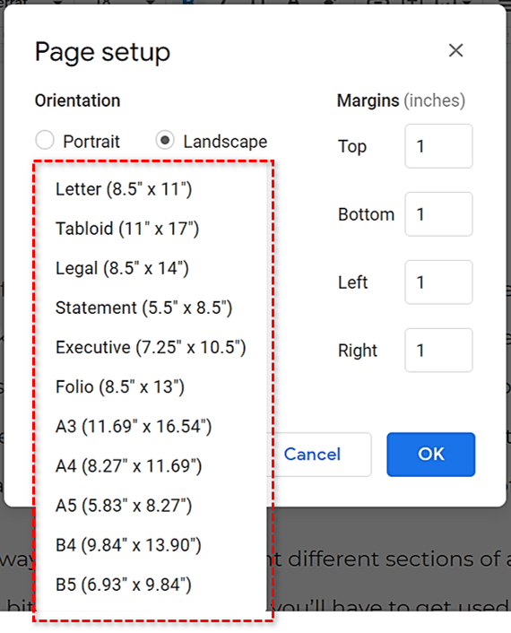 - Google Docs 文档的纸张尺寸支持以下尺寸: