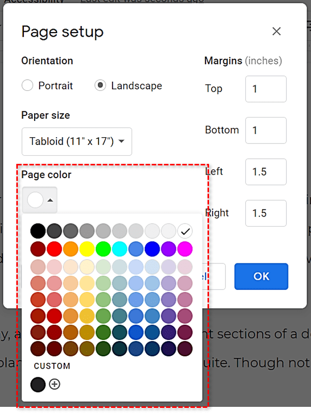 - 更改“页面颜色”会将文档中每个页面的背景更改为所选颜色.因此,如果您希望背景变为黑色以便将文本颜色更改为白色,则可以通过此选项进行操作。还提供自定义颜色。