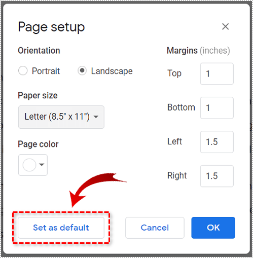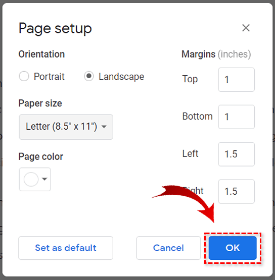 如果您认为横向会比纵向选项更频繁地使用,并且不想每次都经历这些步骤,您可以设置横向作为默认方向。所有需要做的就是点击底部 Set as default 在之前的“页面设置”窗口底部找到点击OK。
