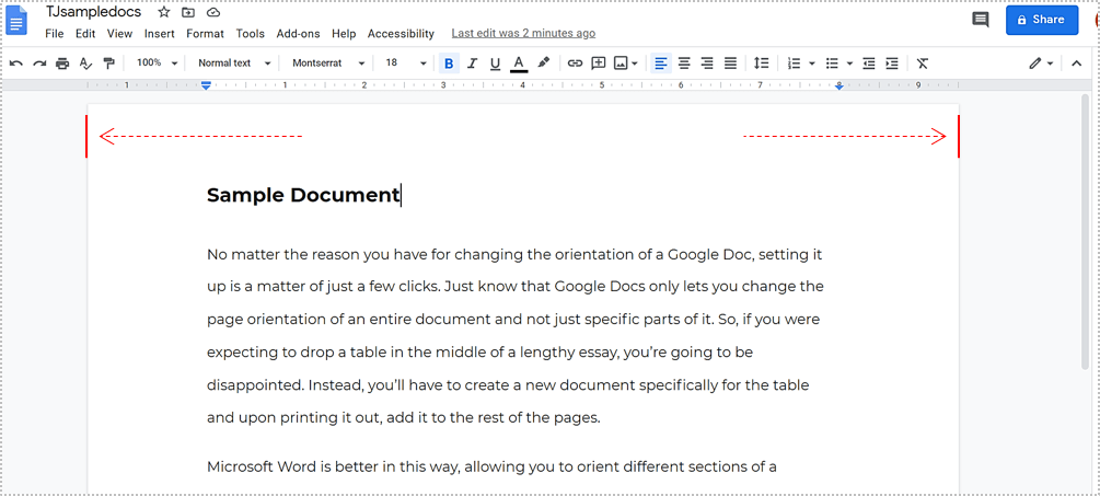 Google Doc 的方向设置为 portrait 默认情况下,并且有充分的理由。它只是最有意义。纵向通常用于您在网络上找到的绝大多数文档。以这种方式最好查看充满冗长文本的页面。如果你不同意,也许你应该考虑一下你正在阅读这篇文章的页面方向。