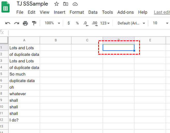- 打开要排序的电子表格,然后单击要重复数据删除的数据几行的空单元格。