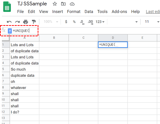 - 关闭括号以完成公式。在示例图像中,它看起来像 '=UNIQUE(A1:A12)',其中我选择了 A 列的第 1 到 12 行。