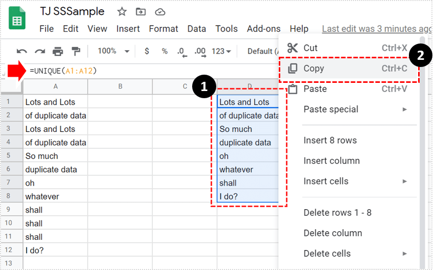 选择具有唯一条目的单元格。右键单击并选择复制。