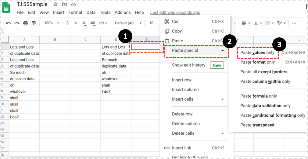 6.应该删除公式,以便能够删除具有重复值的原始数据。我们可以通过复制和粘贴不带公式的唯一条目来完成此操作。