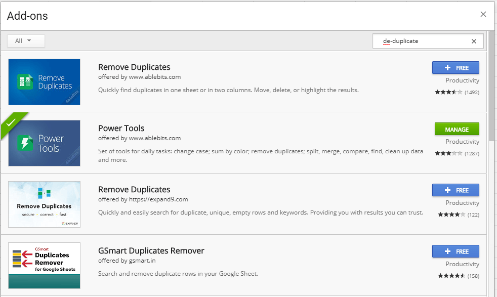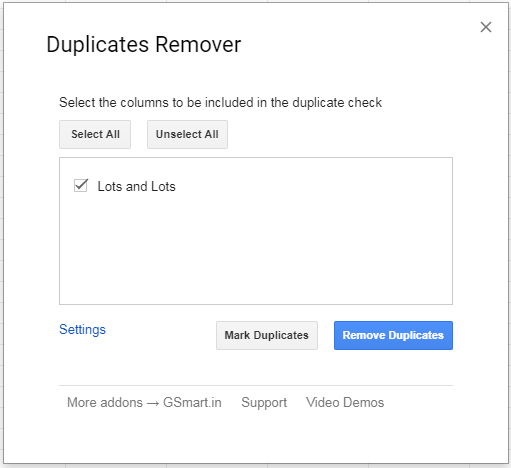 Google Sheets 支持大量的一种或另一种附加组件库,并且周围有一些相当不错的附加组件。其中一些是专门为删除重复项而设计的。在这个例子中,我使用了“GSmart Duplicates Remover”,但这些附加组件中的大多数都做几乎相同的事情。