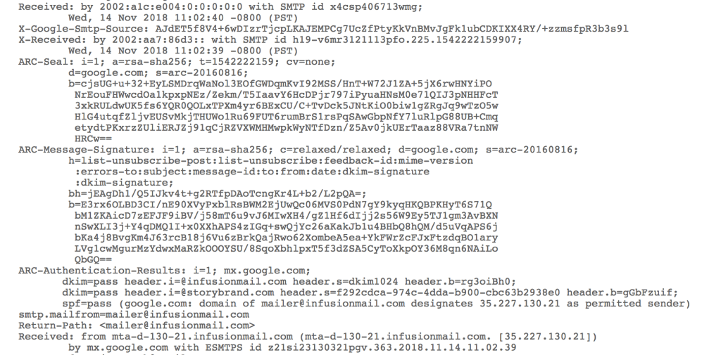 要查看 Gmail 中任何电子邮件的元数据,请点击电子邮件右上角的三个点。然后,单击“显示原件”。正如您从下面的屏幕截图中看到的那样,元数据将显示电子邮件在到达收件人途中的每个站点的正确日期和时间。