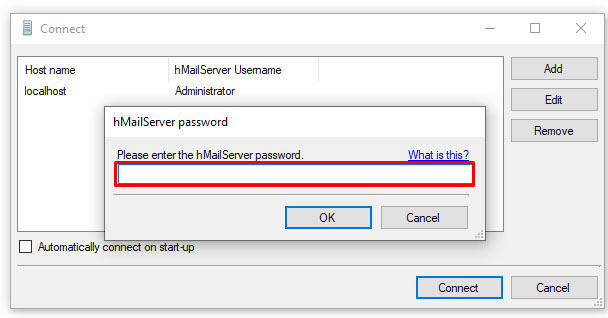 - 在hMailServer界面,点击localhost,点击<强>连接,然后输入密码。
