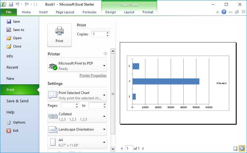 如果您只需要在电子表格中打印几个图形,您并不总是需要为它们设置打印区域。而是使用光标在工作表上选择一个图表。然后打印预览将仅包括所选图形,如下面的快照所示。