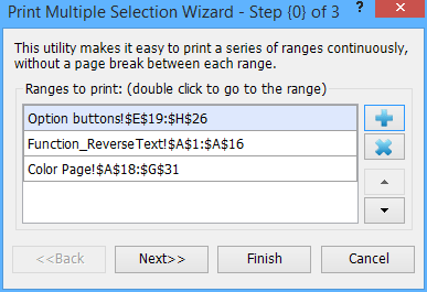 点击对话框上的+按钮选择单元格要包含在页面打印输出中的范围。您可以按向上和向下按钮重新排列单元格范围引用。单击下一步按钮以打开打印选项。
