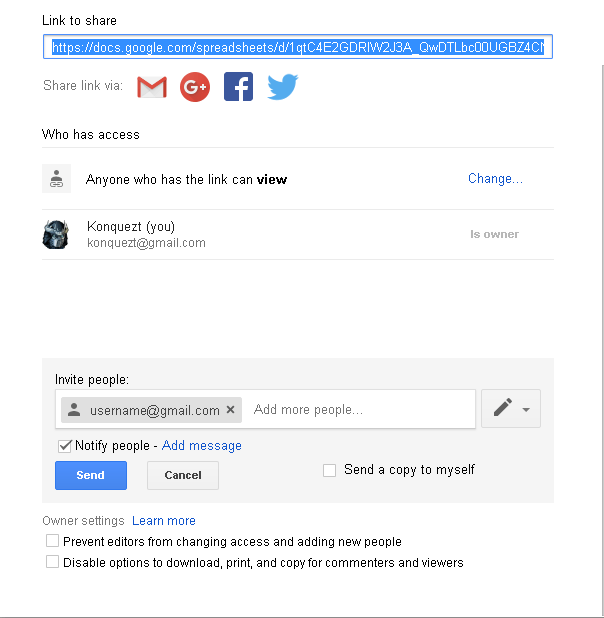 - 您现在可以访问与以前相同的共享 URL,尽管这些选项现在只能通过右侧的 更改... 链接进行交换。您现在可以通过单击关联的徽标直接将链接分享到 Gmail、Google+、Facebook 和 Twitters。现在出现了一个“通知他人”复选框,您可以通过添加消息向收到工作表副本的人留言。您还可以通过勾选相应的框来选择将副本发送给自己。