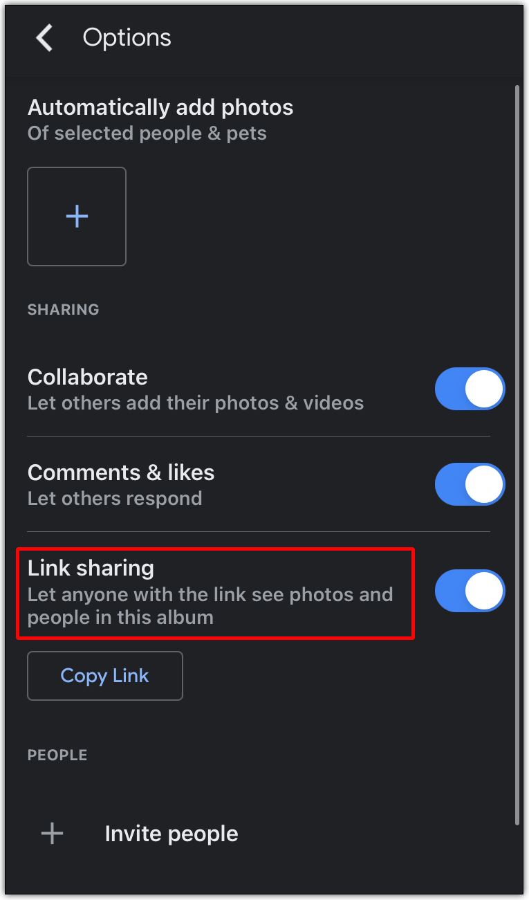 - 切换“链接共享”按钮以禁用共享选项。