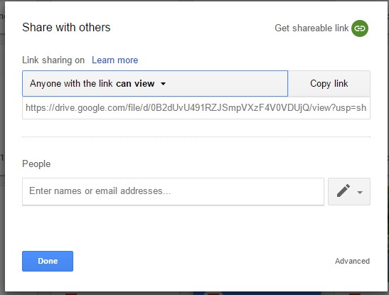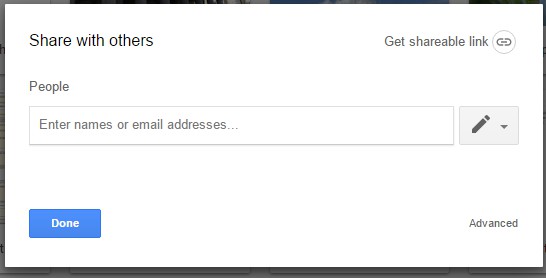 点击上方窗口右下角的Advanced打开直接在下面的快照中设置。然后您可以选择通过 Twitter 和 Google+ 等社交媒体分享超链接。此外,您还可以通过选择禁止评论员和观众下载、打印和复制选项设置来确保没有人复制共享文件。选择阻止编辑者更改访问权限和添加新人选项以确保编辑者无法与其他人共享文件。