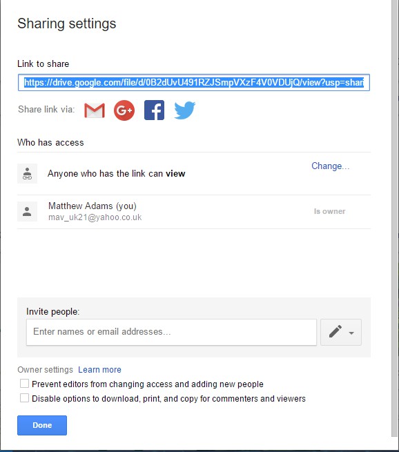 有关更多链接共享选项,请单击共享设置打开下图中的窗口。然后您可以按复制链接按钮将超链接复制到剪贴板。单击知道链接的任何人框以选择文件的访问级别。