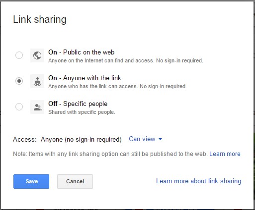 在那里你可以选择一个公开网络 选项。任何知道链接的人都可以打开该文件,而无需登录 Google 云端硬盘。您还可以选择关闭 – 特定人员选项来停用所有文件链接。按保存按钮确认所选设置。