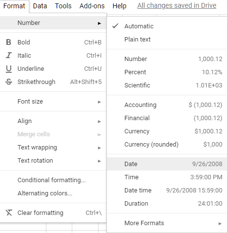 如果您不想使用快捷方式,您可以选择使用菜单选项在 Google 表格中格式化日期或时间。为此: