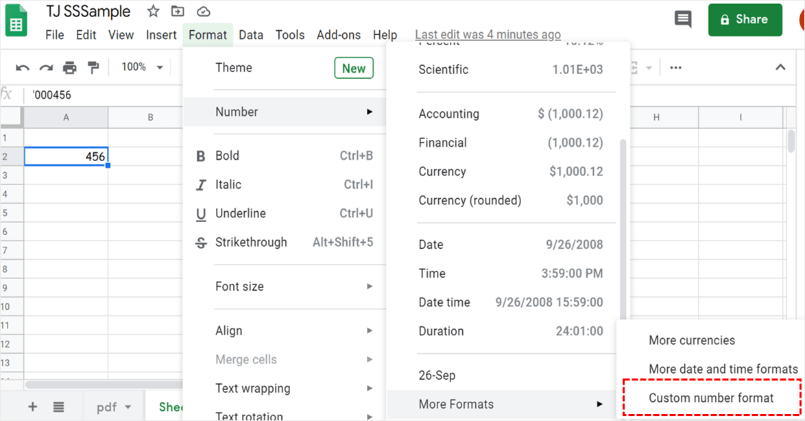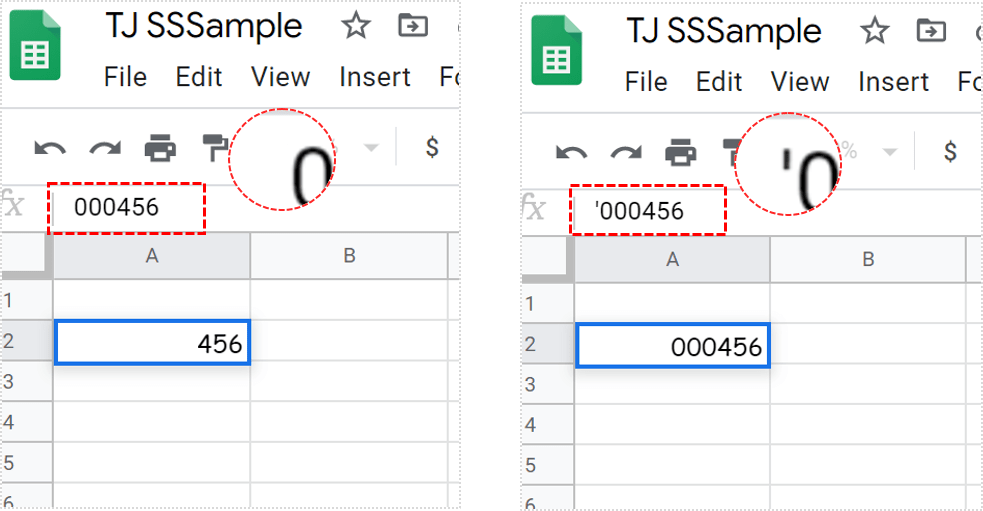 例如,在您按 Enter 键后,'000456 将在 Google 表格单元格中保留为 000456。撇号的作用与前一种方法大致相同——它将数字更改为文本。