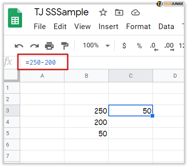 例如,在 Google 表格电子表格中选择单元格 C3。在 fx 栏中输入公式“=250-200”,然后按 Enter 键。 50 将出现在单元格 C3 中。