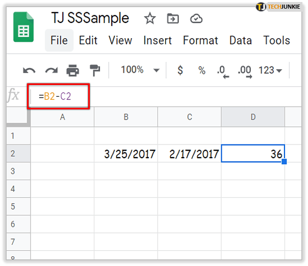 例如,在表格电子表格中选择单元格 B2 并输入“3/25/2017”作为第一个日期.单击 C2 并输入“2/17/2017”作为从 B2 中扣除的日期。然后选择 D2 以在该单元格中包含公式。在 fx 栏中输入“=B2-C2”,然后按 Enter 键。