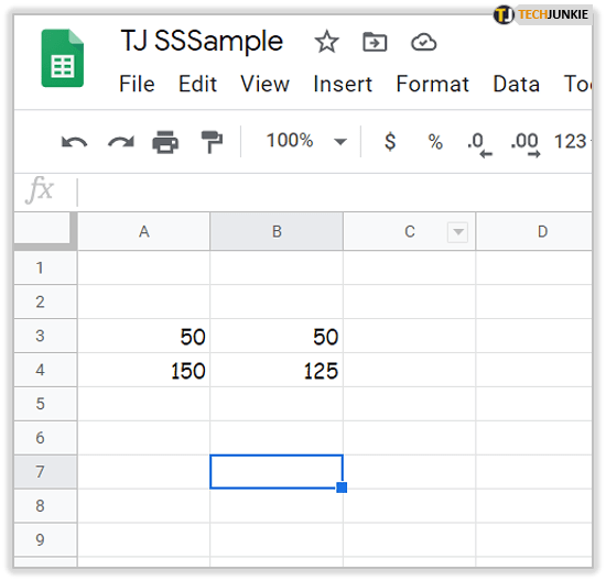 例如,在单元格 A3 中输入值“50”和“150”和 A4 表格中的表格电子表格。在单元格 B3 和 B4 中输入“50”和“125”。那么你的电子表格应该直接匹配下面的例子。