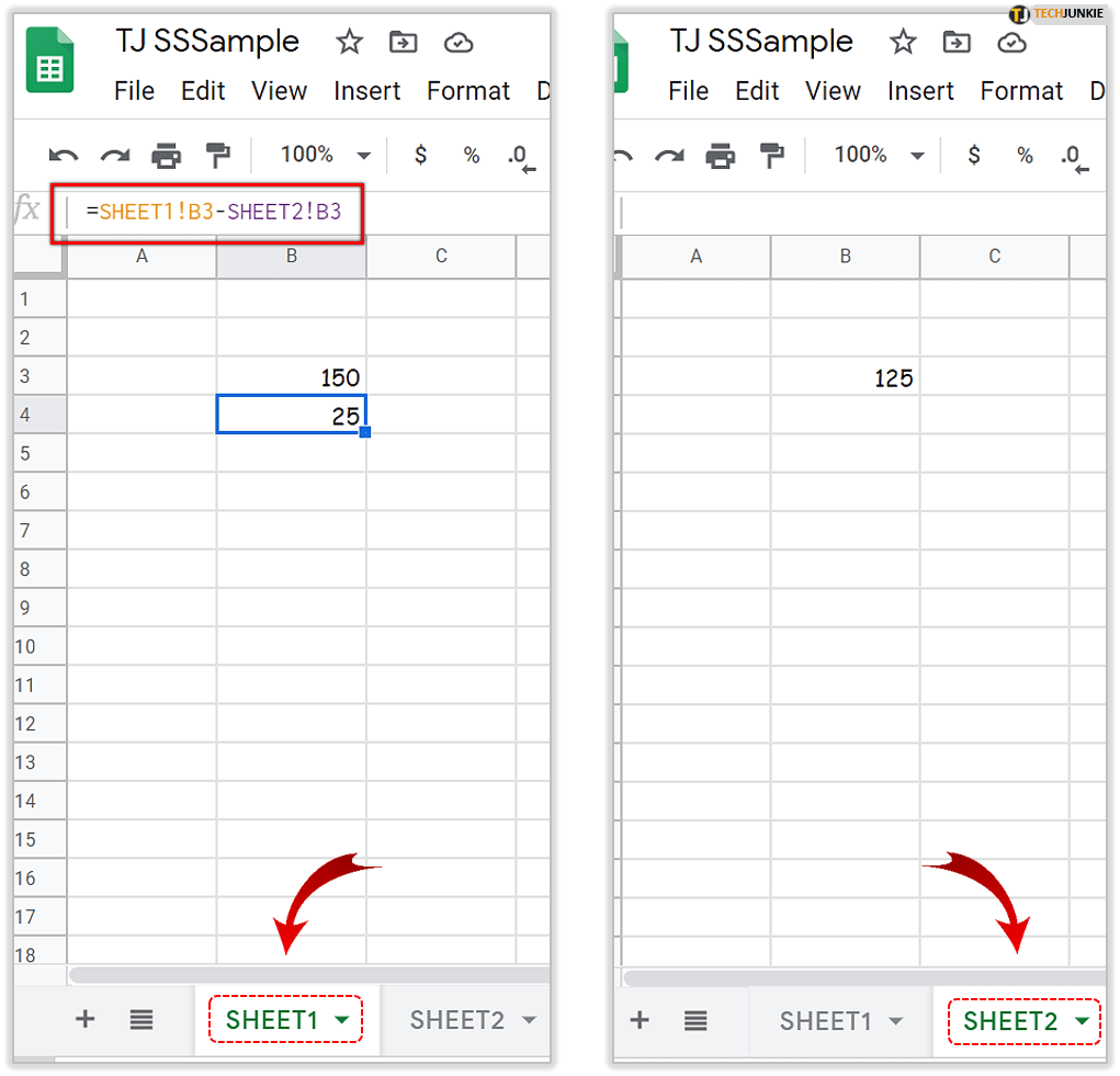 现在您可以向电子表格添加一个公式,从第一个工作表中的 B3 中减去工作表 2 中的 B3。选择工作表 1 并单击单元格 B4。在效果栏中输入‘=Sheet1!B3-Sheet2!B3’。 B4 一共会包括 25,也就是 150 和 125 的差值。