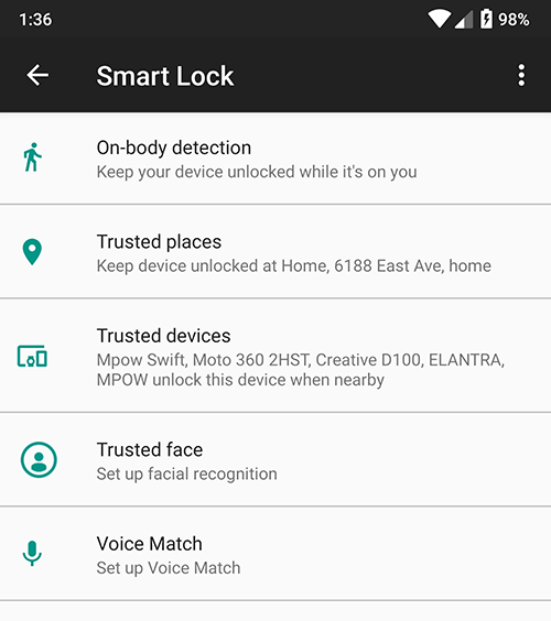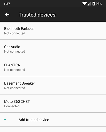 - 受信任的设备:这可能是五个 Smart Lock 选项中最好的,因为它非常适合在您附近时确保您的设备安全并在您离开时保持手机锁定。此选项允许您在与小工具配对时保持手机解锁。智能手表和健身追踪器是实现这一目标的理想之选,但它还可以帮助您在驾驶配备蓝牙的汽车、使用蓝牙耳机跑步或与一组蓝牙扬声器配对时保持手机解锁。