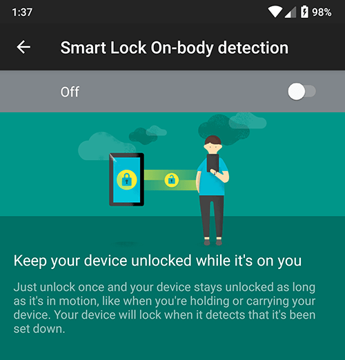 - 身体检测:只要手机在您手中或您身上,此设置允许您在禁用锁定之前解锁您的设备一次。使用智能手机的传感器阵列,设备会跟踪您的设备何时在使用中,因此您可以关闭显示屏,但在手机在手时保持解锁状态。当您的手机意识到它已被设置时,您的手机将自动重新锁定,需要输入密码。这不是 Smart Lock 提供的最安全的方法,但它非常酷。