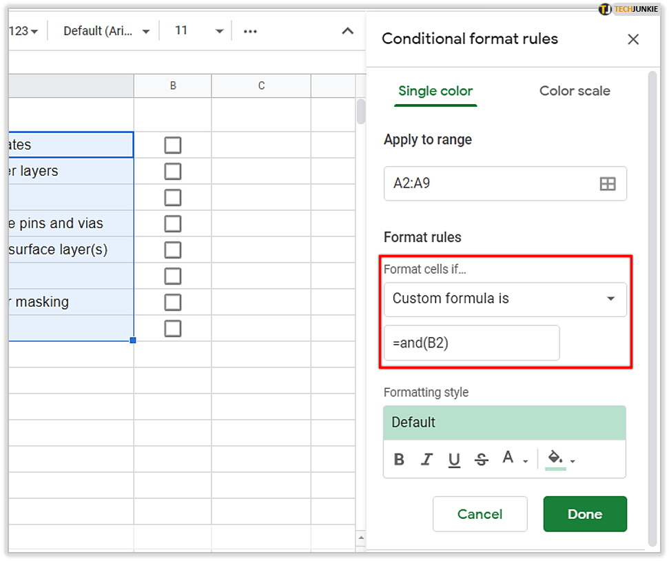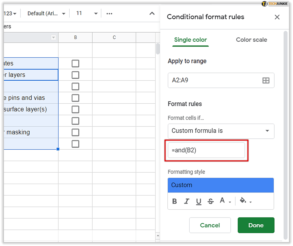 由于普通单元格和复选框单元格的格式规则相同,因此您可以根据其他部分自定义它们你的电子表格。这意味着您可以使用不同的颜色来标记它们,此外,它们的字体和字体大小也可以更改。